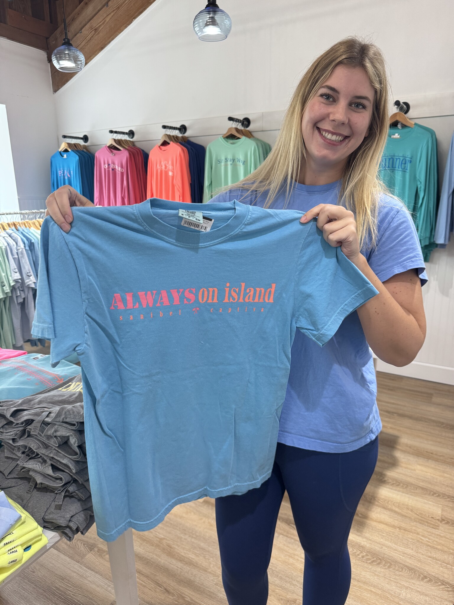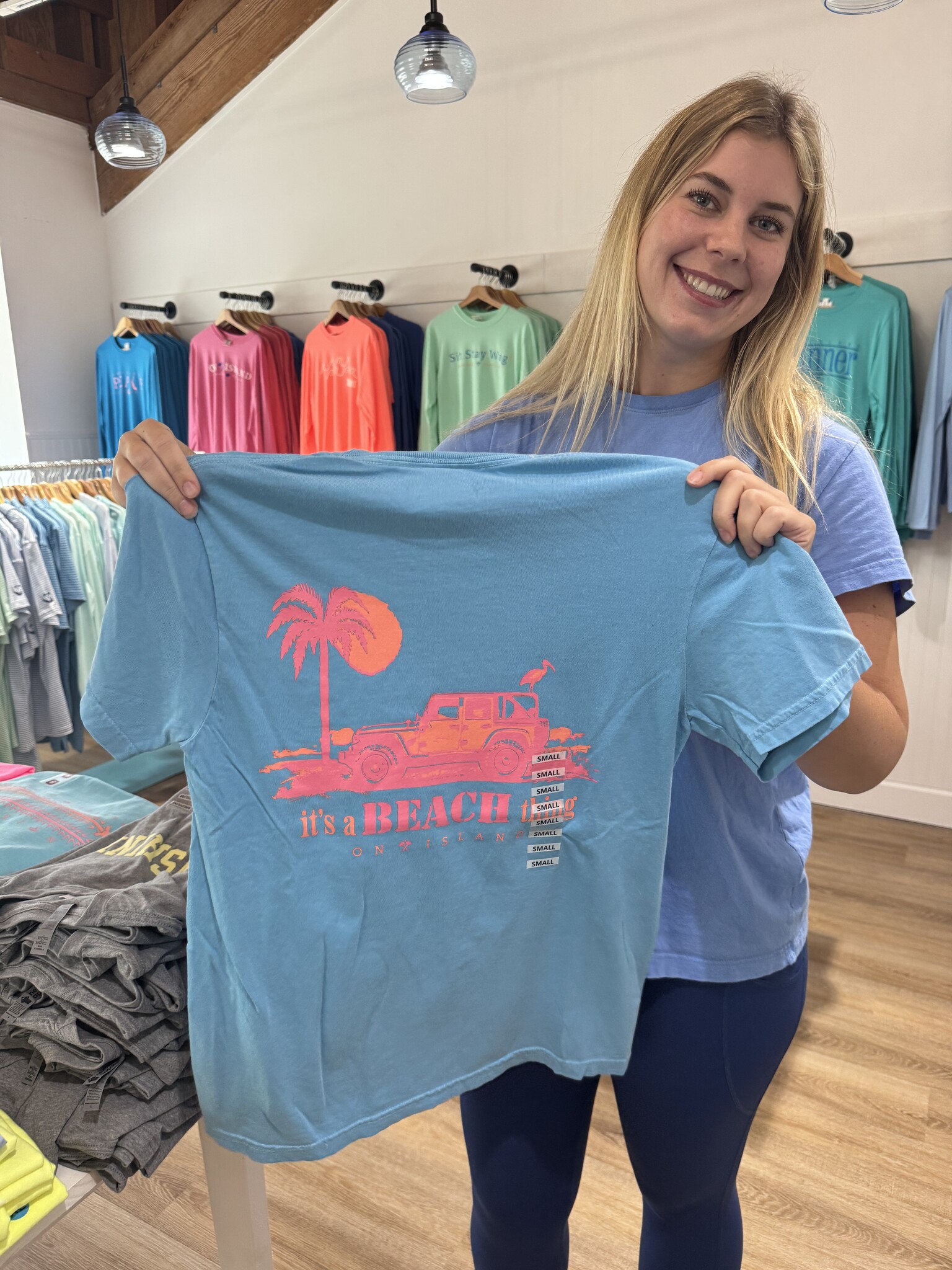 Always on Island on the Front of this 100% cotton cozy crew neck tee. It's a Beach Thing on the Back! You don't have to live on Island or own a Jeep to love this colorful shirt.