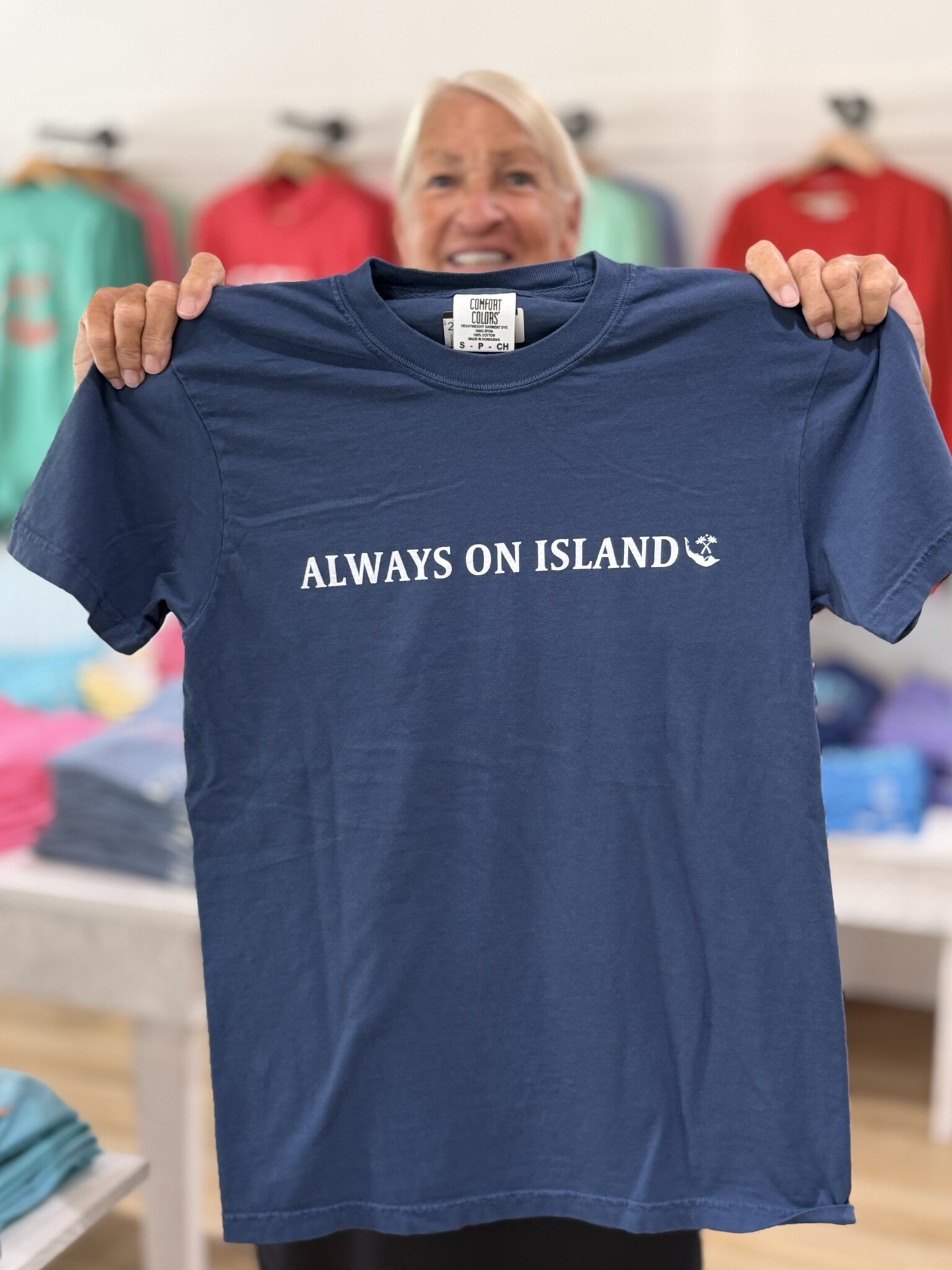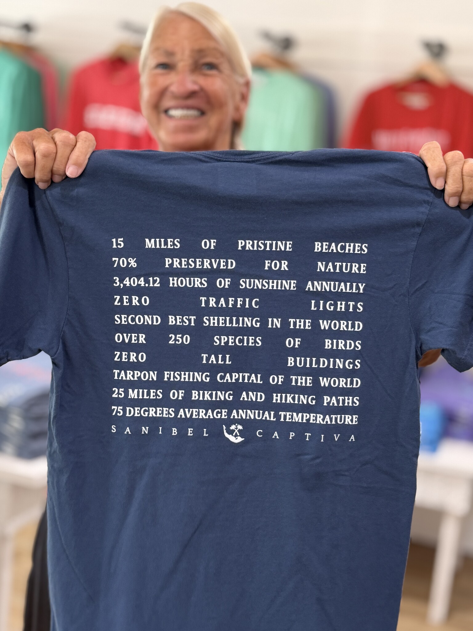No matter where you may be, you are "Always on Island" with this Sanibel/Captiva Statistics cozy Comfort Colors short sleeve shirt. * 15 Miles of Pristine Beaches * 70% Preserved for Nature * 3,404.12 Hours of Sunshine Annually * Zero Traffic Lights * Second Best Shelling In The World * Over 250 Species of Birds * Zero Tall Buildings * Tarpon Fishing Capital of the World * 25 Miles of Biking and Hiking Paths * 75 Degrees Average Annual Temperature. We're Waiting For You!