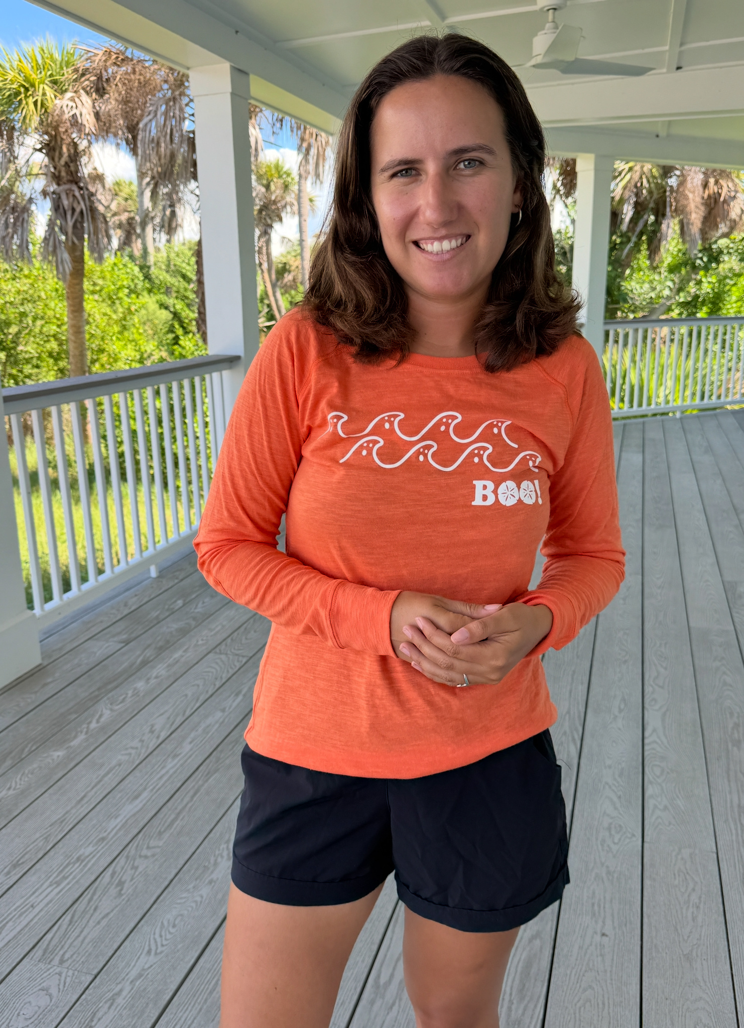 Ghosts are in the waves! This super spooky ladies light weight slub jersey long sleeve tee has a feminine fit. This tee has a slimmer fit than our usual tees so we recommend you go up a size if you don't want it too fitted. You'll be the spookiest in this tee and it will add a beachy vibe to all your Halloween festivities!