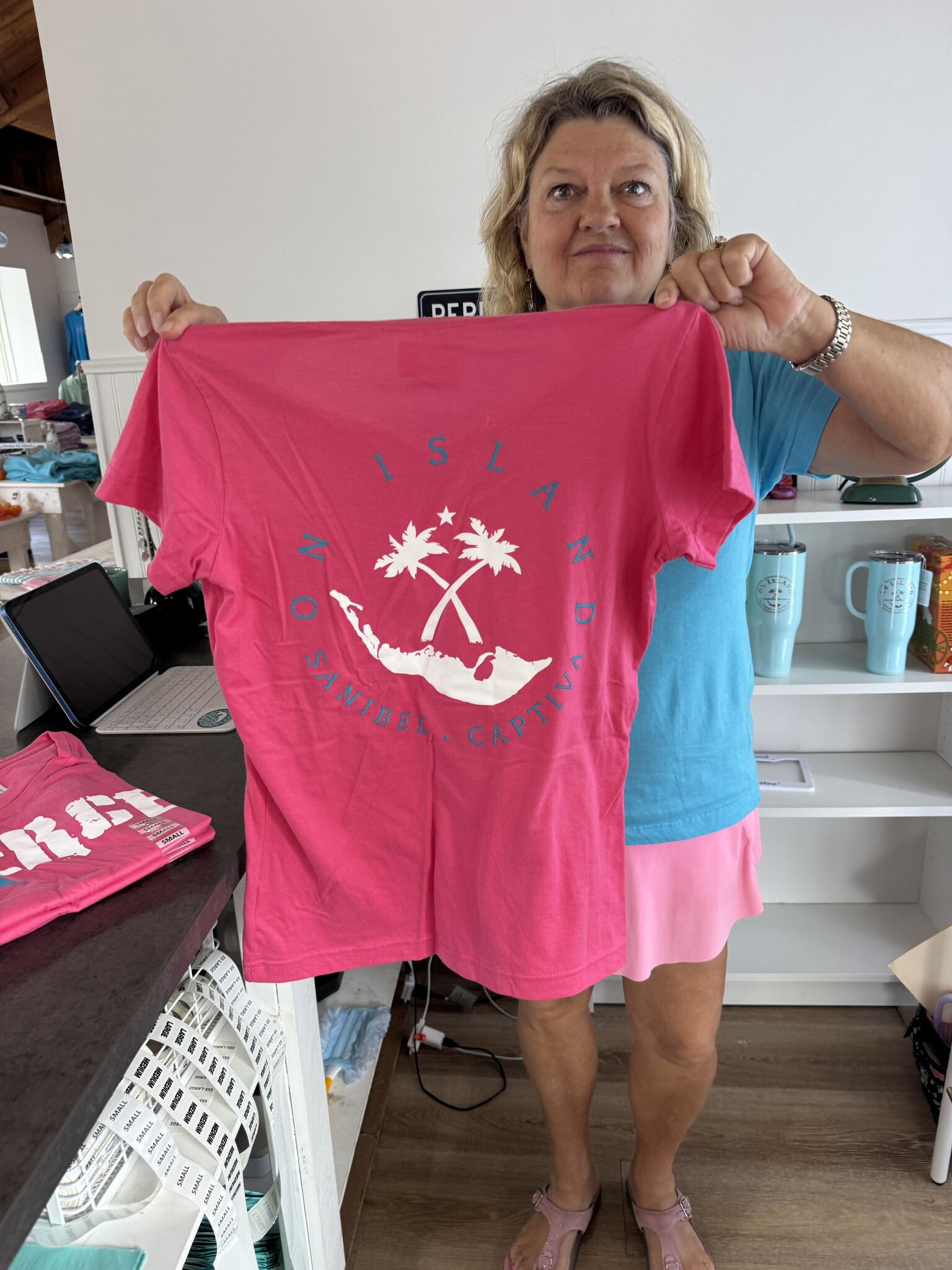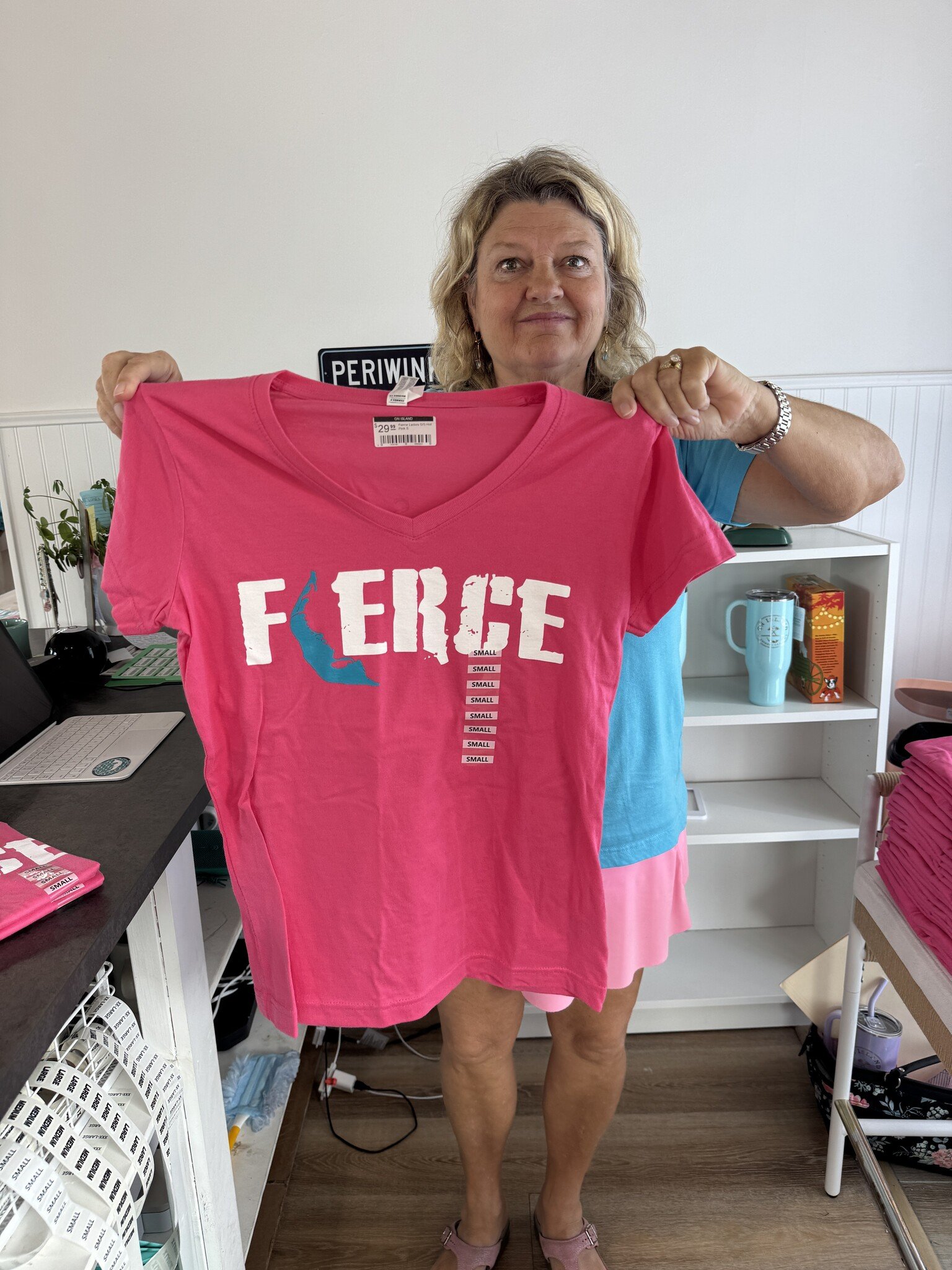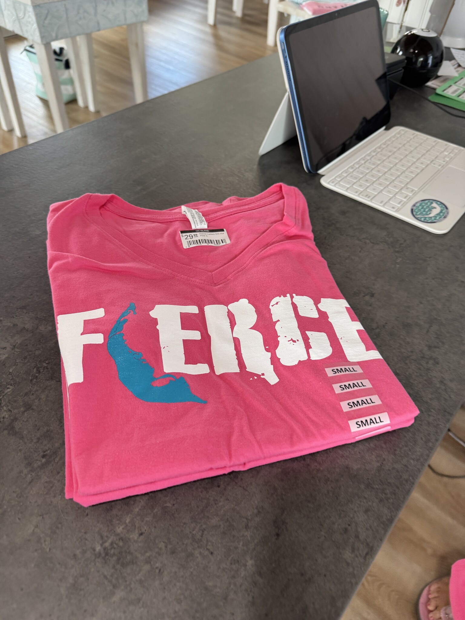 Show the World you are Fierce with our Breast Cancer Awareness shirt! October is Awareness Month, and On Island is a proud Sponsor of Pink Out Sanibel/Captiva, but you can wear this shirt all year long and show your support. The "I" in Fierce is the map of our dear Sanibel and Captiva islands and on the back you will see the On Island logo. These comfy shirts are V-Neck in Ladies sizing.