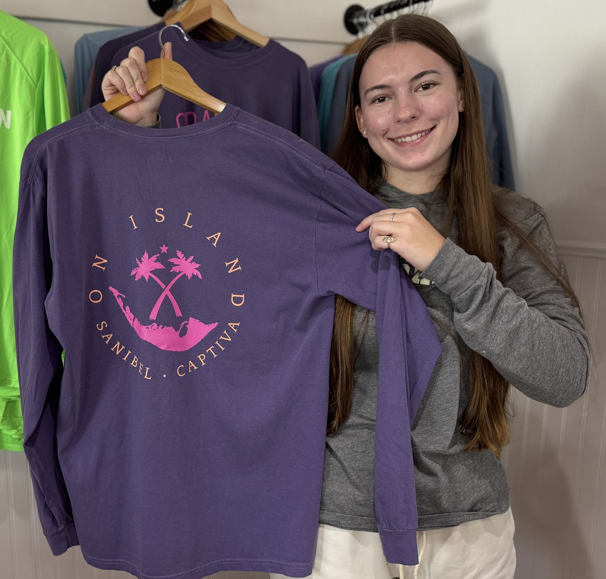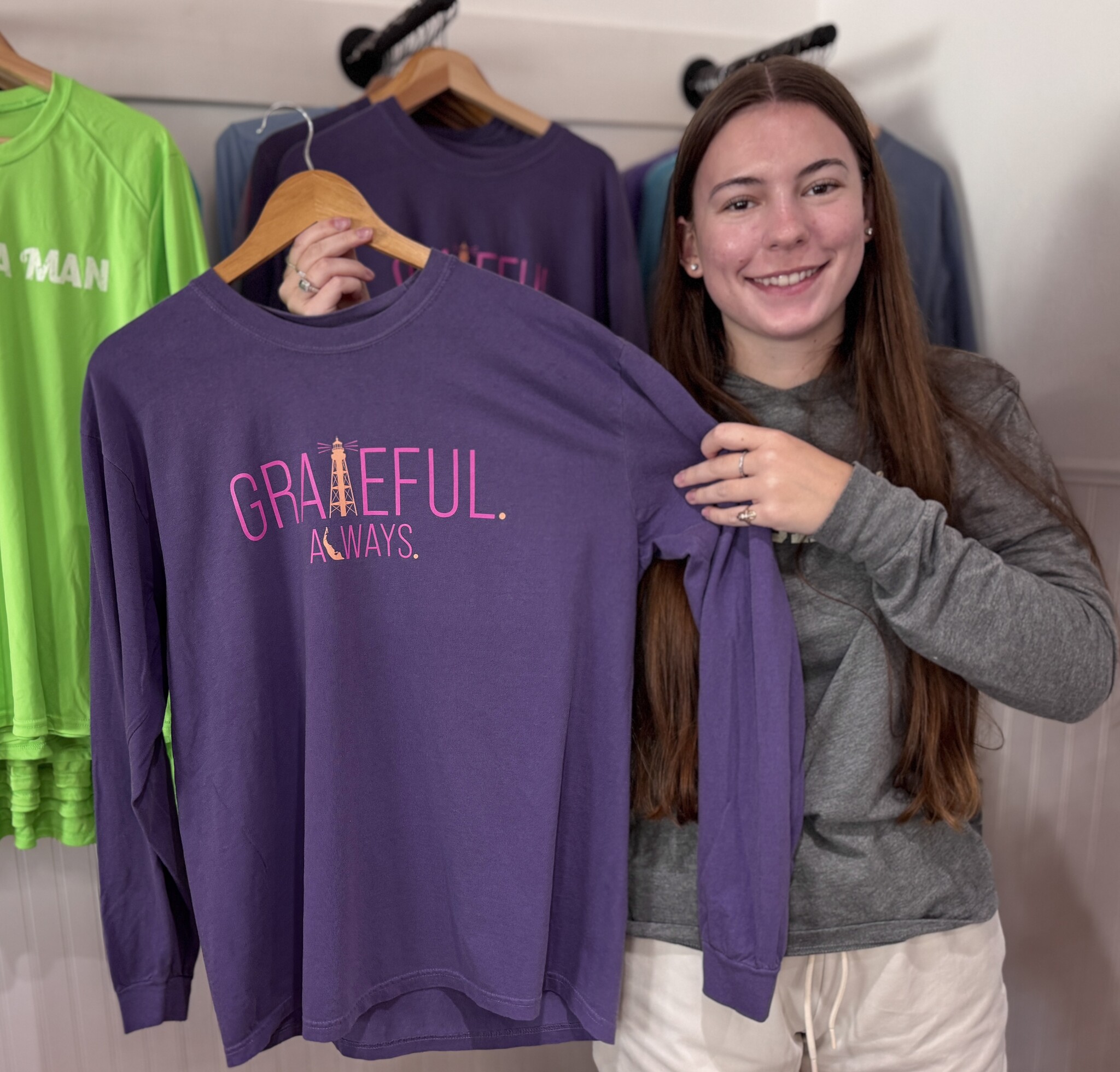 Our new Grateful Always shirt honors the Thanksgiving holiday season and acknowledges all we have to be grateful for! This super soft, ladies tee tee has a shallow v-neck and slightly capped sleeves and fits true to size. The "T" in Grateful is the Lighthouse of Sanibel Island. The "L" in Always is the shape of Sanibel Island.