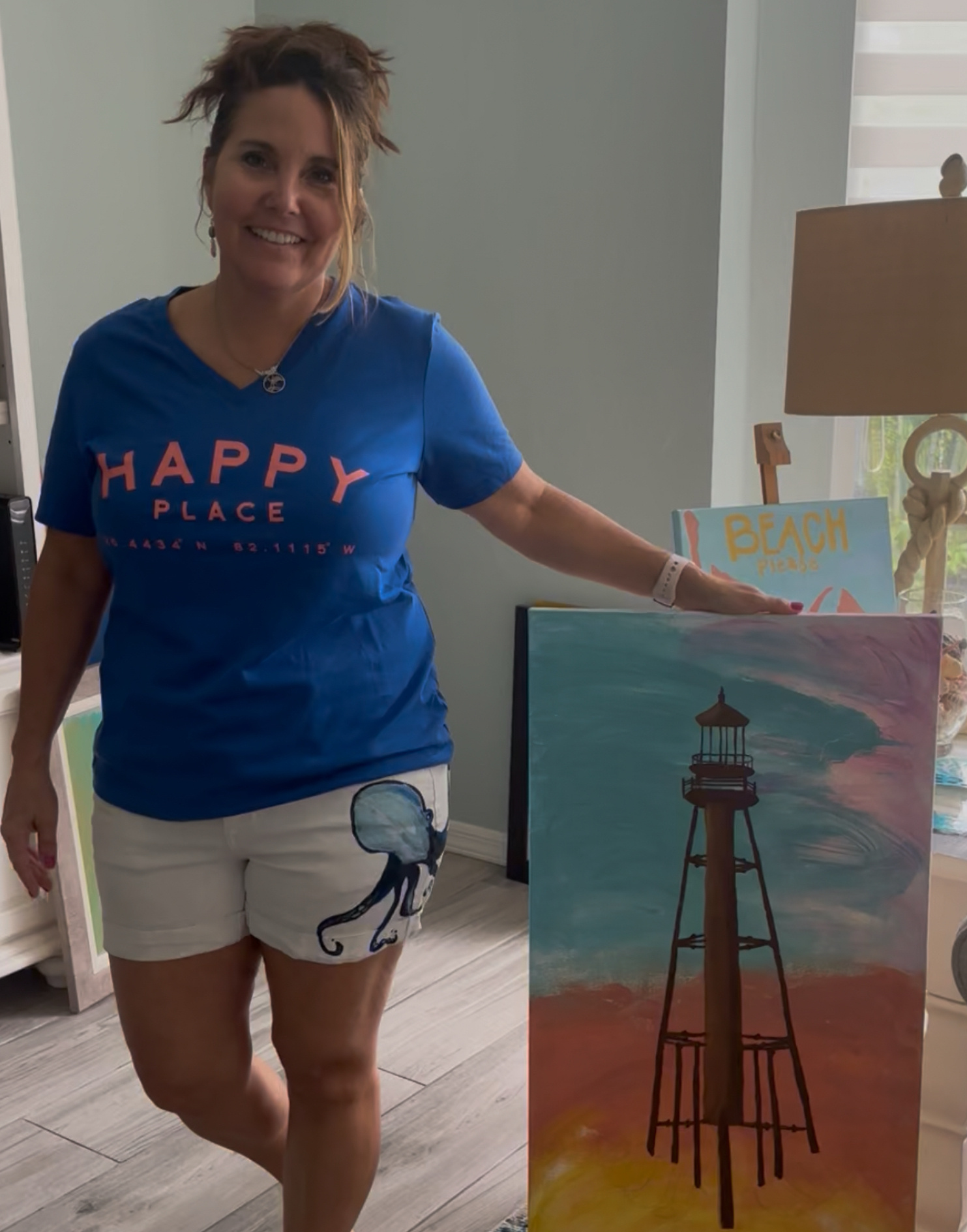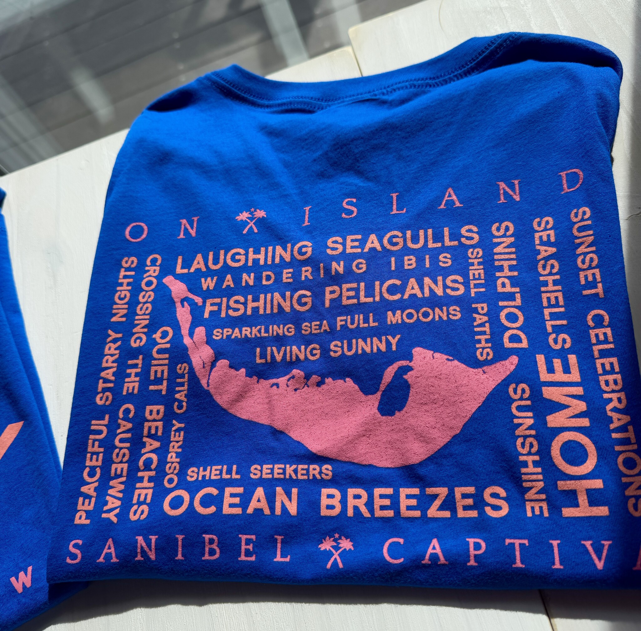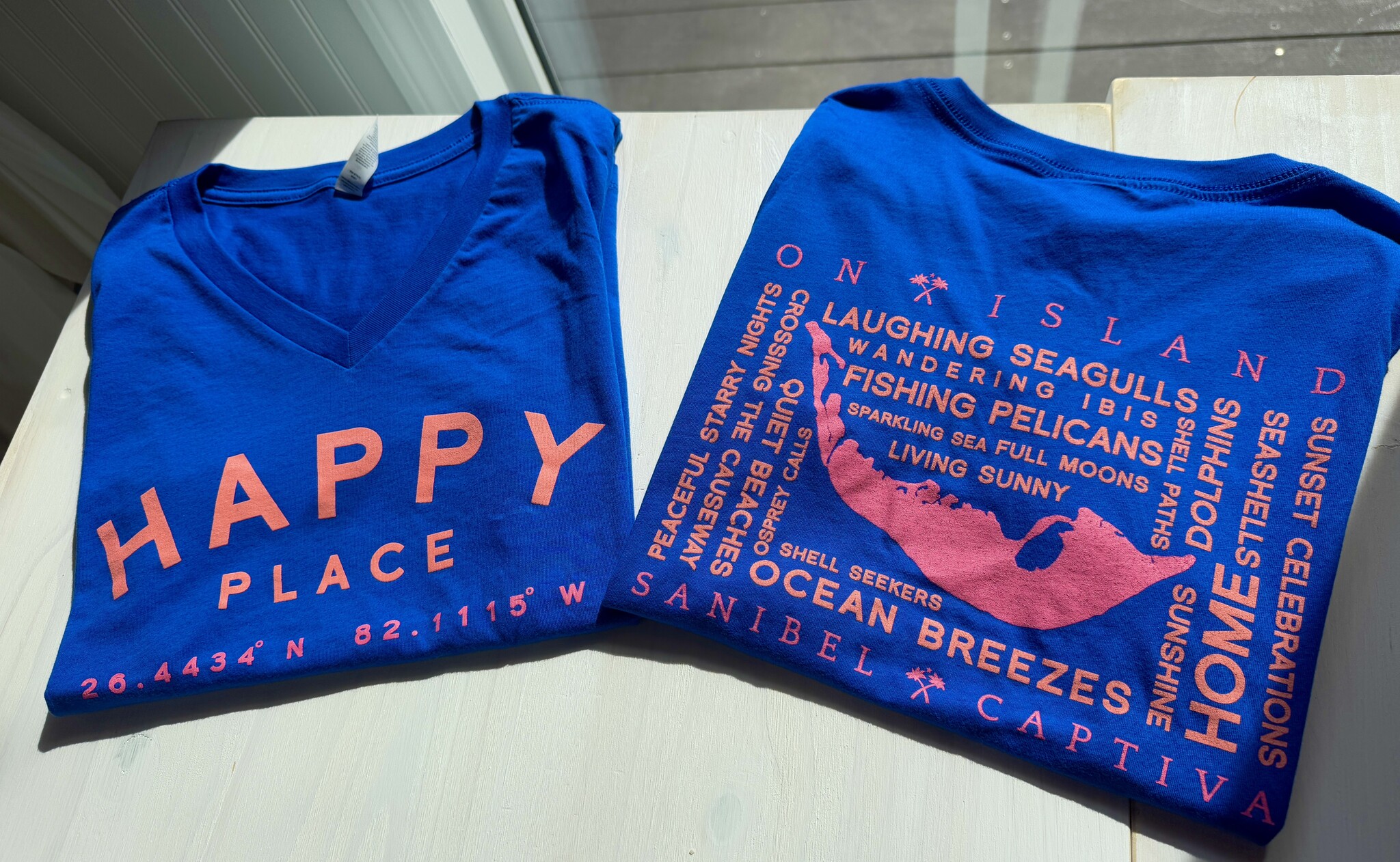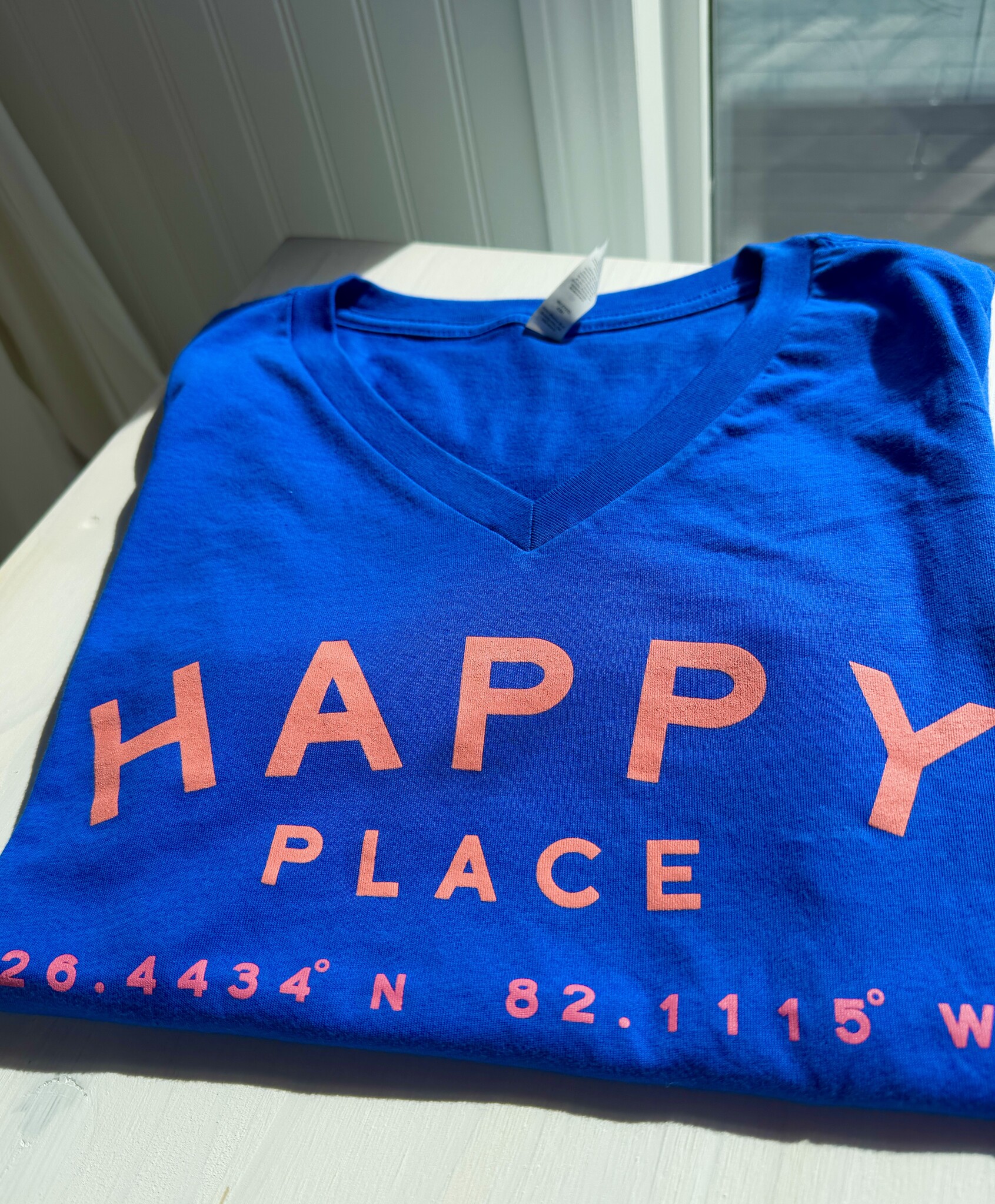 You found your Happy Place and now your favorite tee! With coordinates on front and the islands' map on back with what makes this our special spot. This is on our loose ladies fit with a vneck and slightly capped sleeves. This tee fits true to size, but as you know, we always recommend sizing up if you're between sizes. on Our super soft Comfort Color shirt fits true to size for gents, but ladies may want to size down.