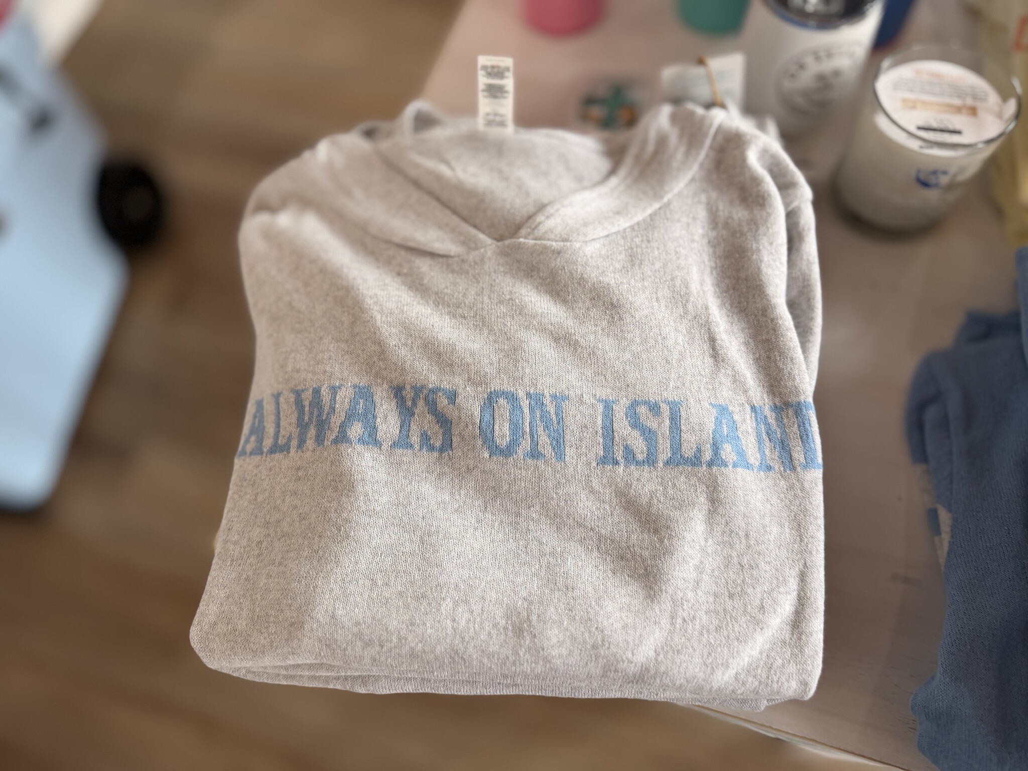 You'll adore this perfect summertime, super lightweight mock hoodie sweater in Light Gray to slip on after a day at the beach or for an outing at sea. "Always On Island" on the front means you'll keep that island vibe even when you're not. With a loose & longer than usual fit, these sweaters are a lovely and comfy way to spend the summer.