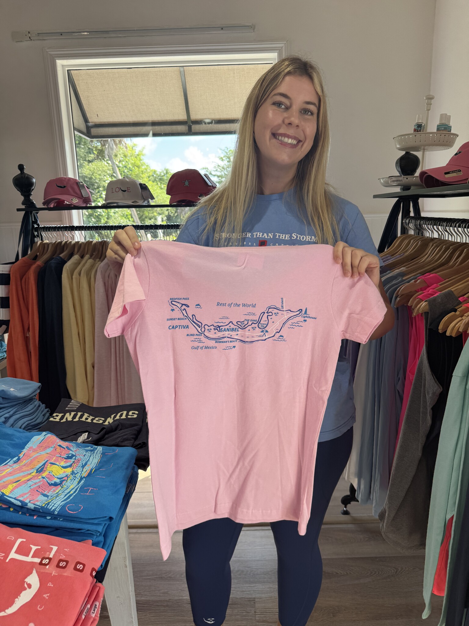 A detailed map of Sanibel and Captiva adorns the back of this super soft, short sleeve shirt. The map highlights some favorite island locations. It has a loose feminine fit with slightly capped sleeves and fits true to size. You'll feel like you're on island when you wear it!
