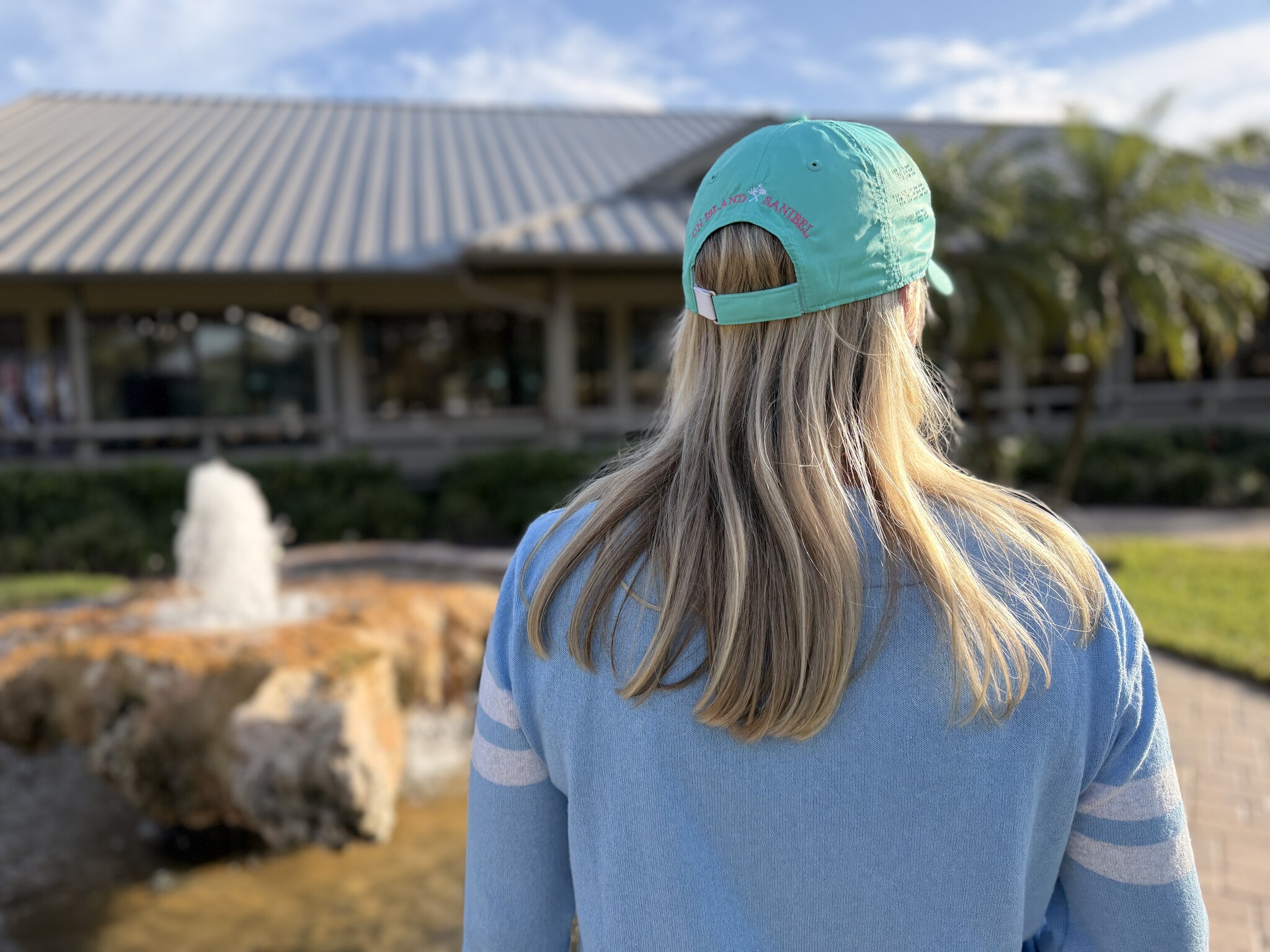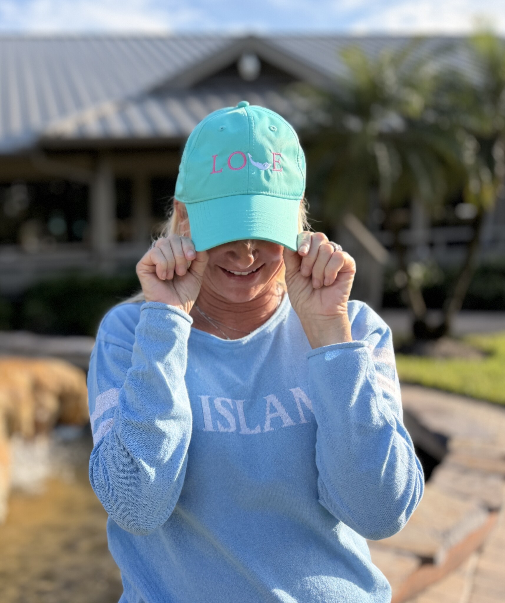 You'll LOVE our LOVE hat! The "v" is the map of Sanibel and Captiva. This is a Performance Hat Ladies Fit with an adjustable slider closure.