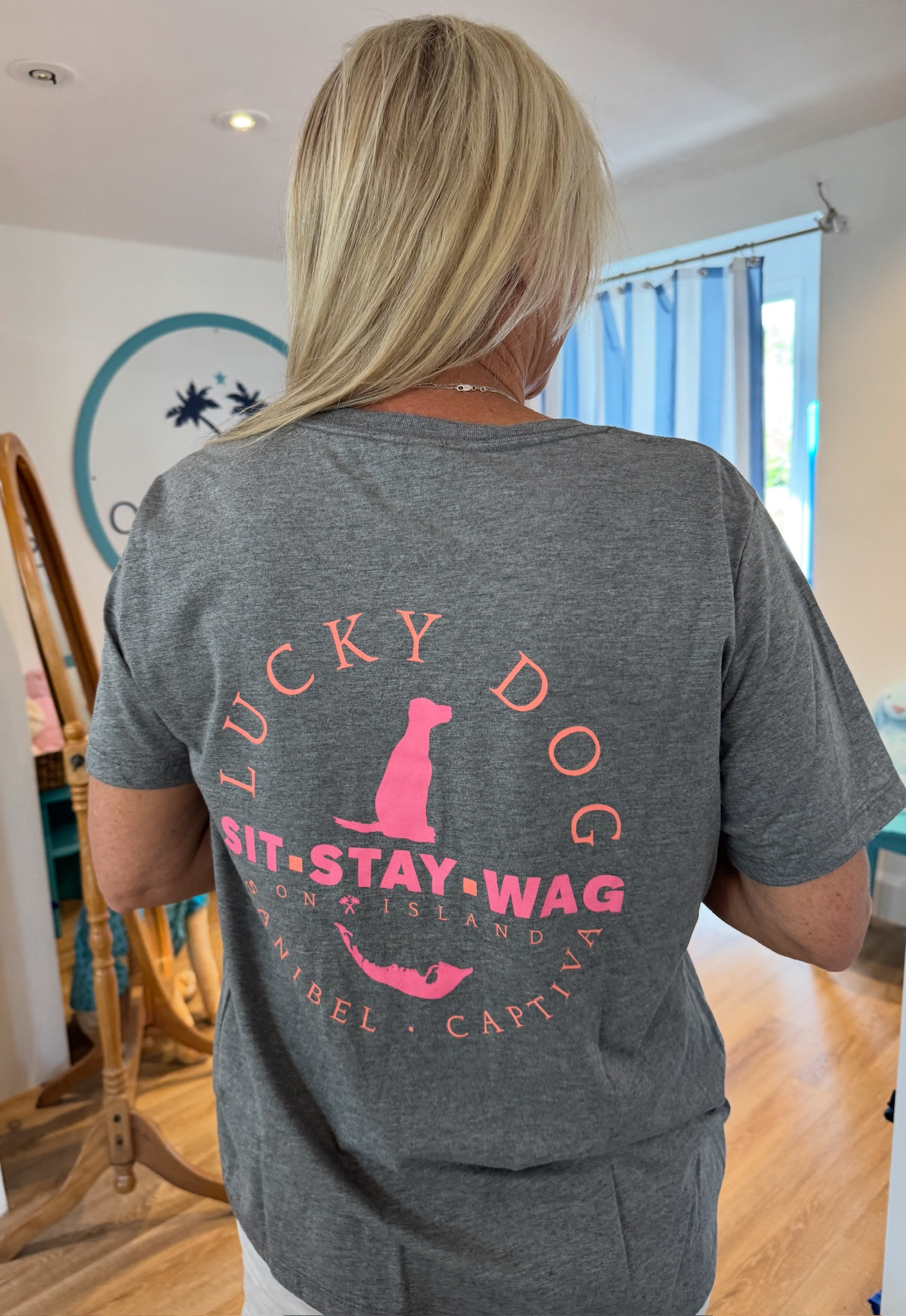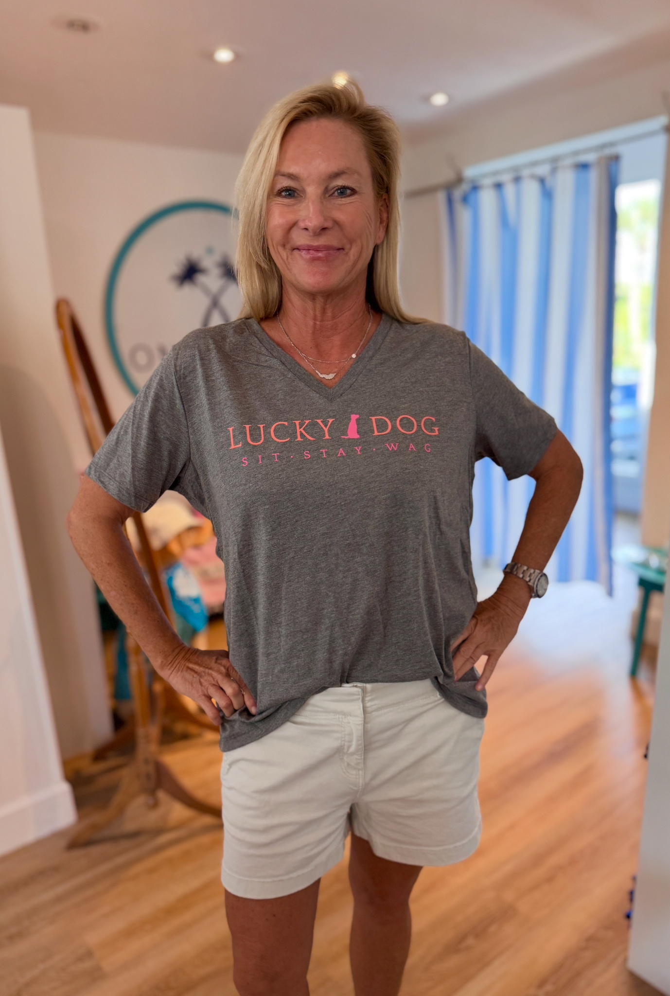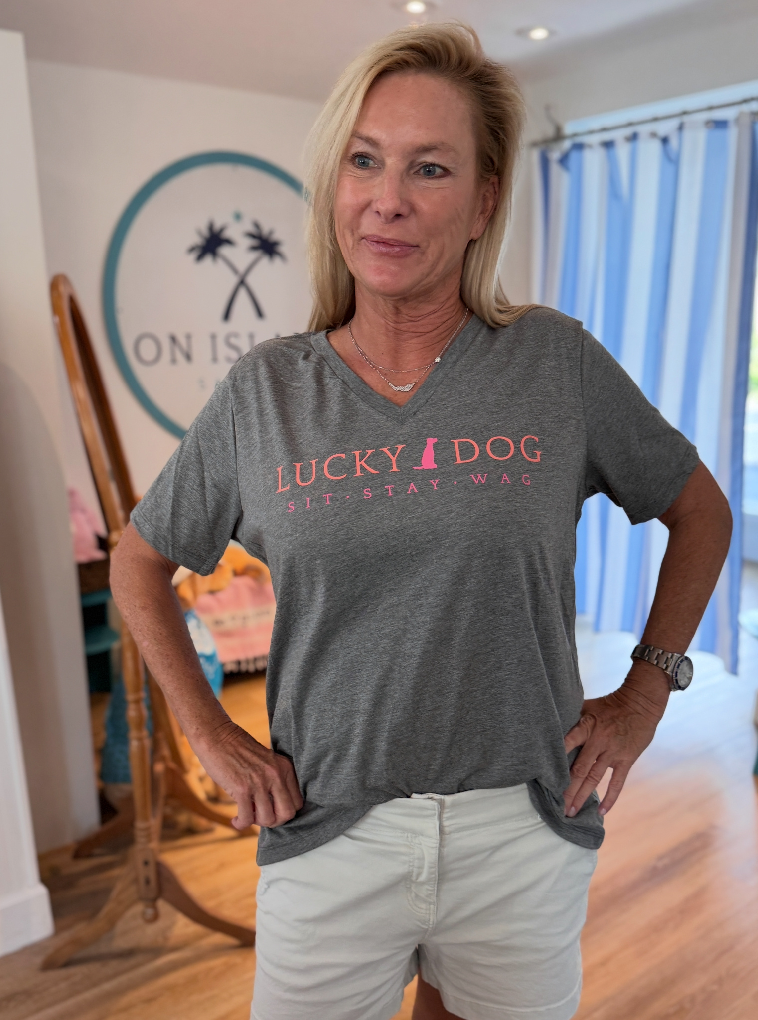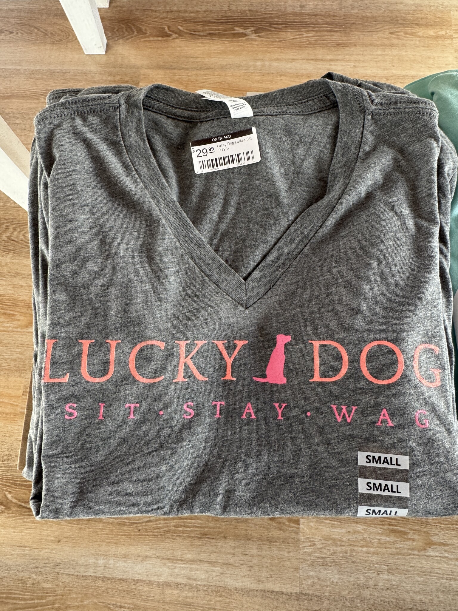 You'll certainly be a lucky dog when you wear this super soft shirt! This shirt has a feminine fit with a v-neck and slightly capped sleeves in gray. This shirt runs true to size but we always recommend going up a size if you're between sizes.