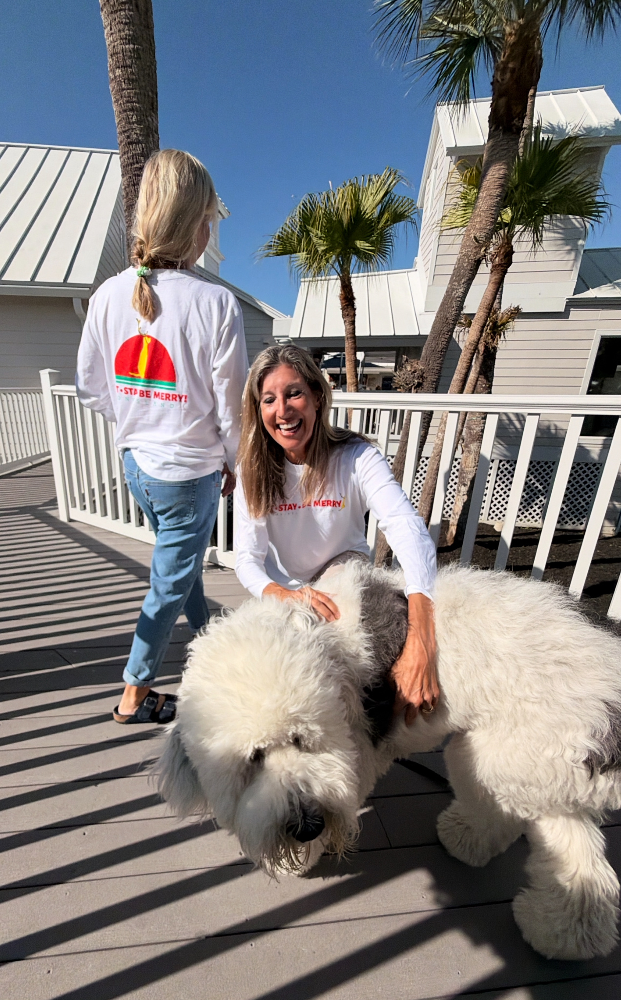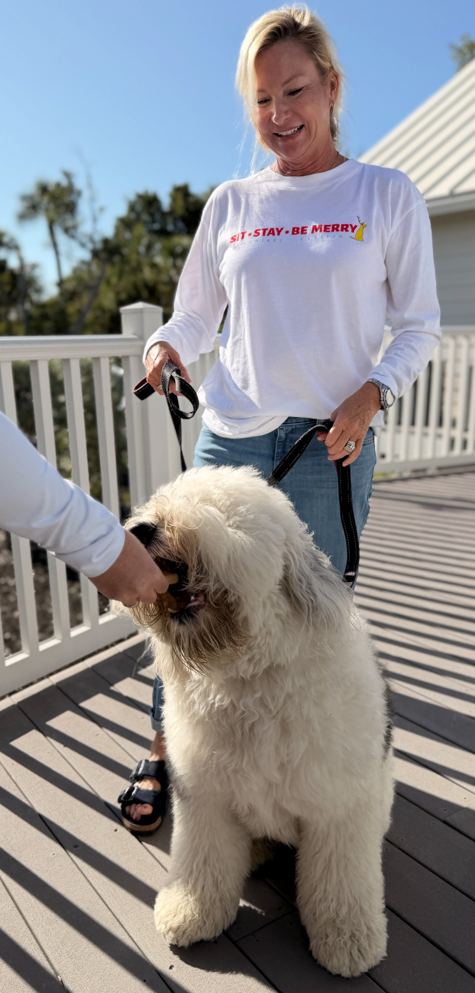Our festive dog is decked out and ready for any of the sea suns' reindeer games! This merry K9 design is on our super soft ring spun cotton tee shirt. This shirt has a relaxed feminine fit with a flattering scoop neck and a front and back shirt tail hemline. This shirt runs large so you may want to size down.