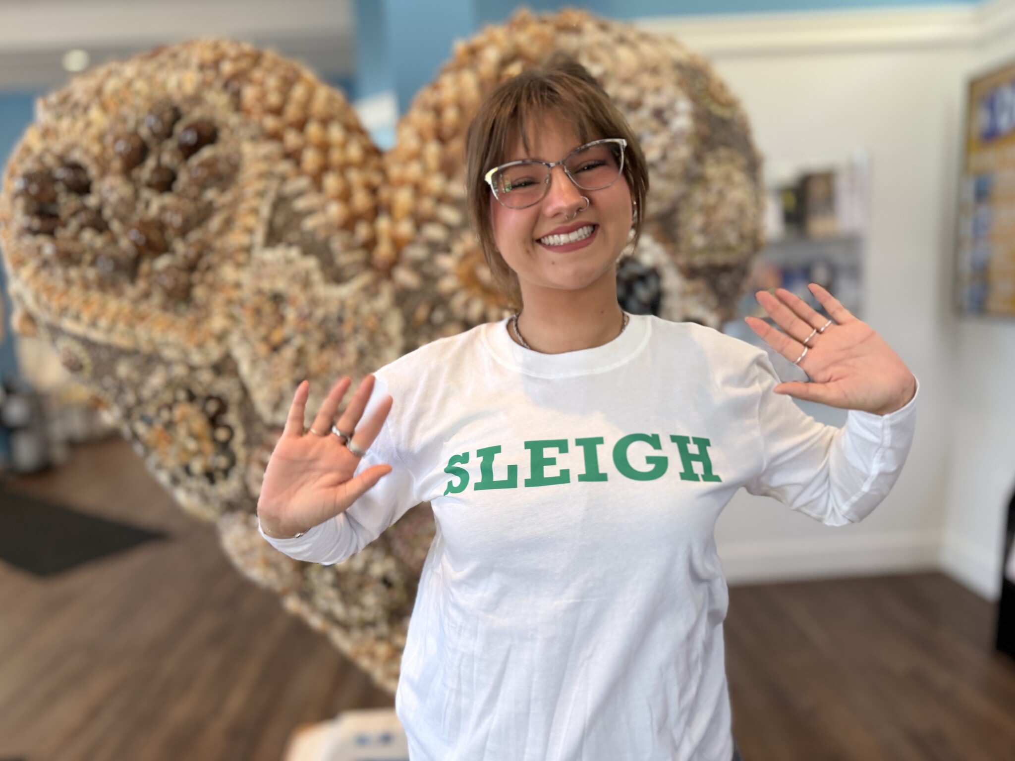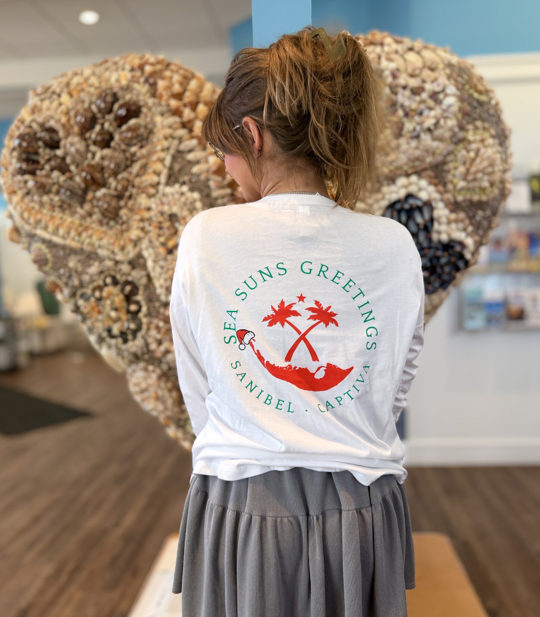 SLEIGH the holidays and be the merriest! This is a 100% ring spun long sleeve cotton tee. The back shows Santa's hat caught on the tip of Captiva. These shirts have a relaxed feminine fit that are true to size, but if you're between sizes, we always recommend everyone to go a size up.