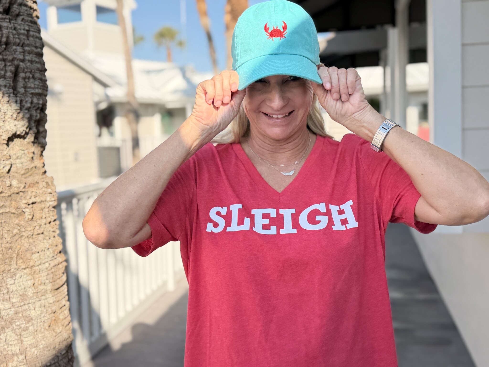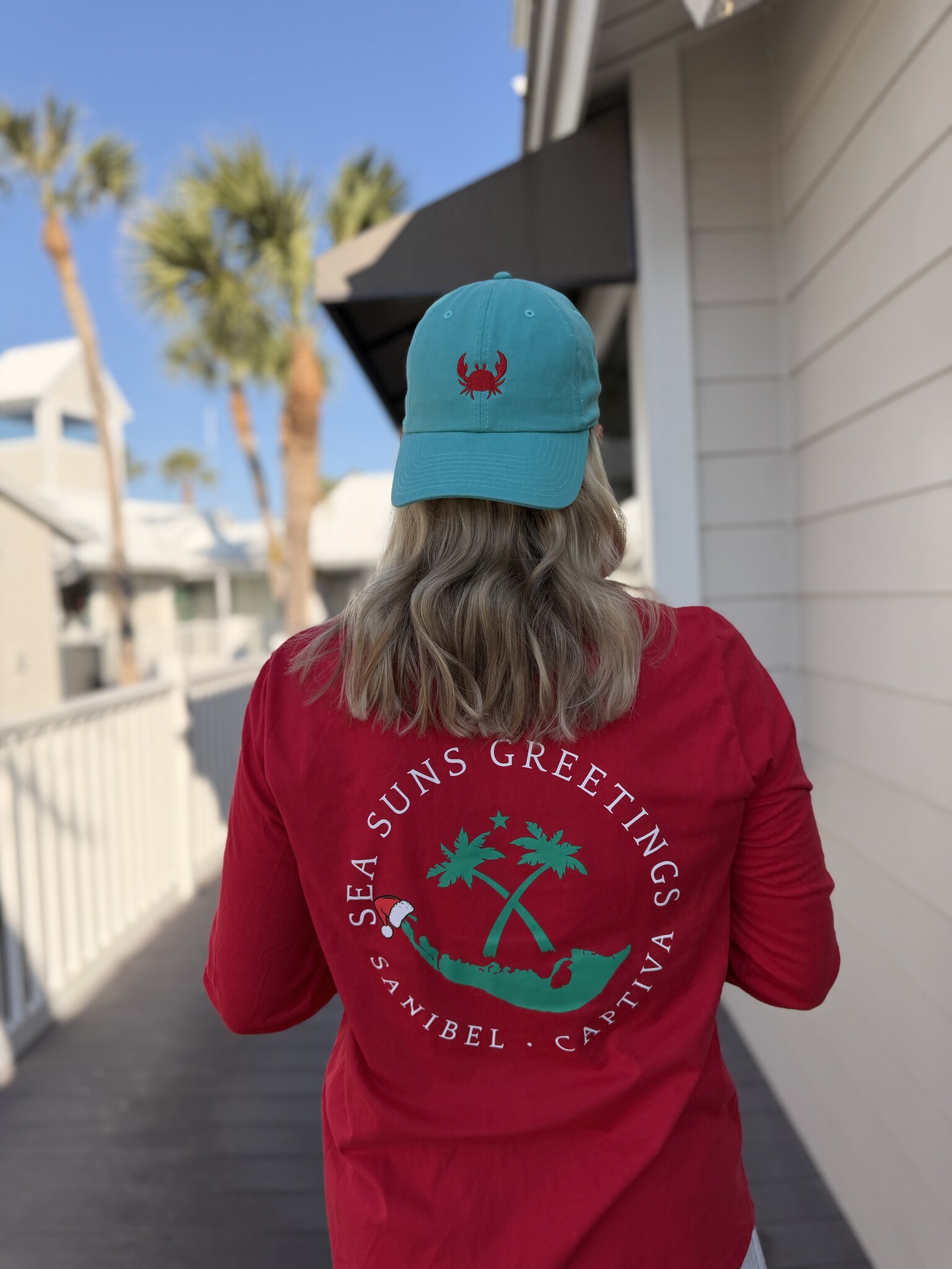 SLEIGH the holidays and be the merriest! This ladies super soft vneck tee is in a nice heather red. The back shows Santa's hat caught on the tip of Captiva. These shirts have a relaxed feminine fit that are true to size, but if you're between sizes, we always recommend everyone to go a size up.