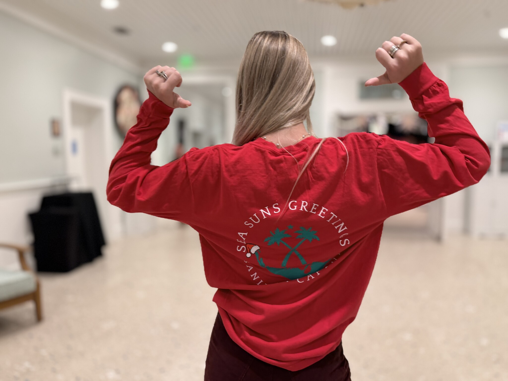 SLEIGH the holidays and be the merriest! This unisex super soft Comfort Colors long sleeve tee is in bright cherry red. The back shows Santa's hat caught on the tip of Captiva. These shirts have unisex sizing so ladies should size down, but if you're between sizes, we always recommend everyone to size up.