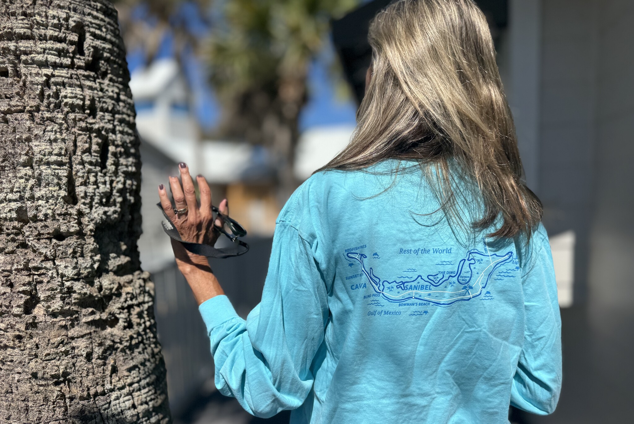 A detailed map of Sanibel and Captiva adorns the back of this super soft, lightweight , unisex long sleeve shirt. The map highlights some favorite island locations and it has an adult unisex fit. You'll feel like you're on island when you wear it!